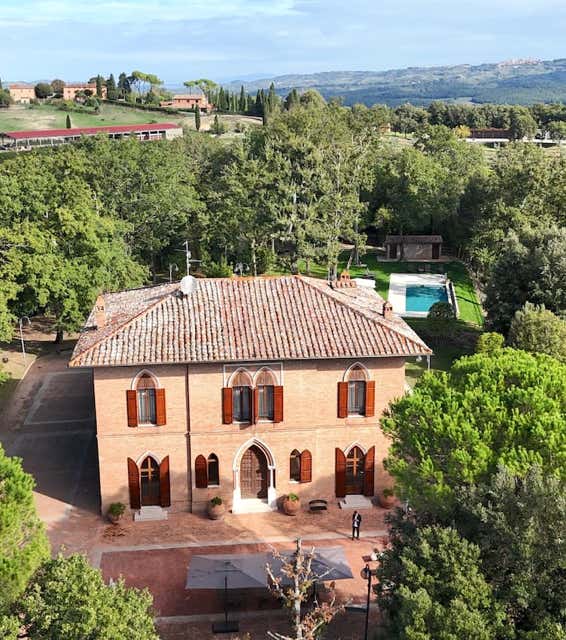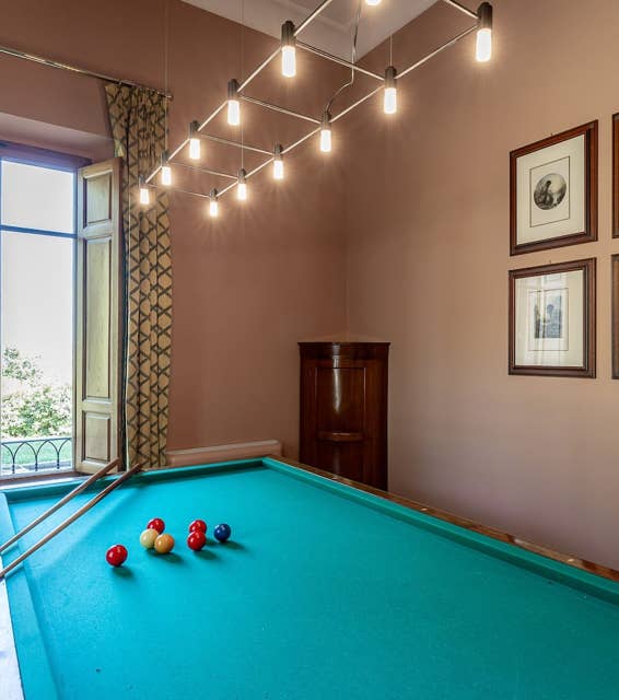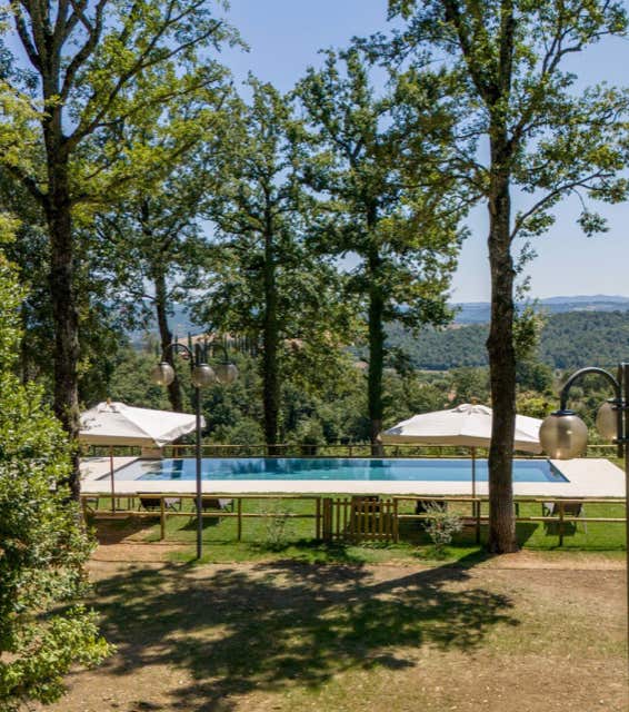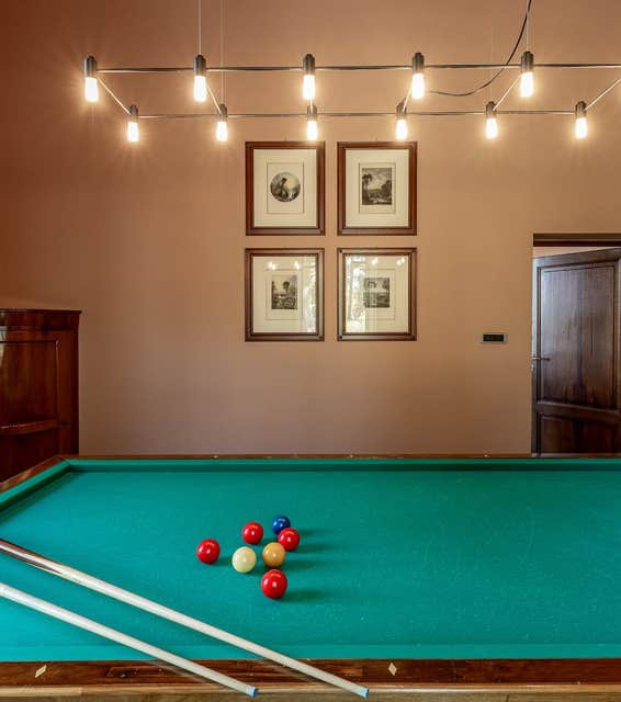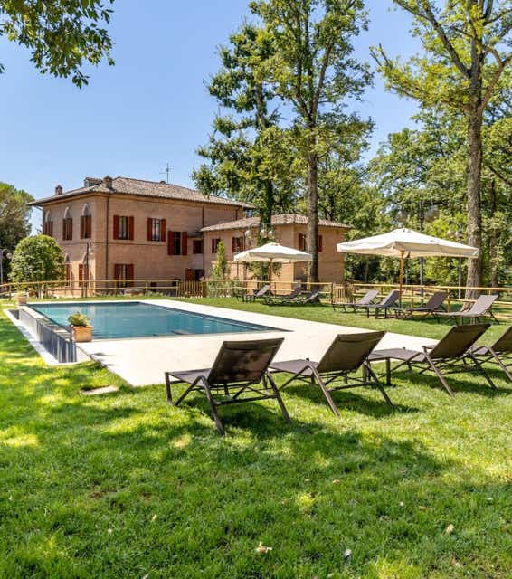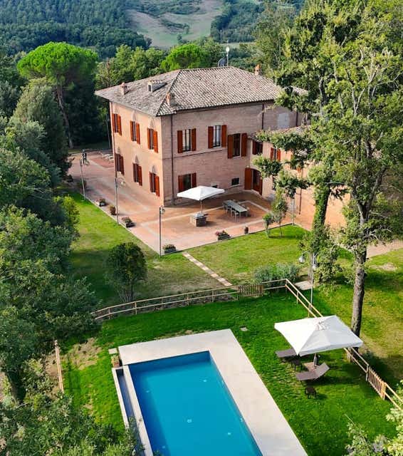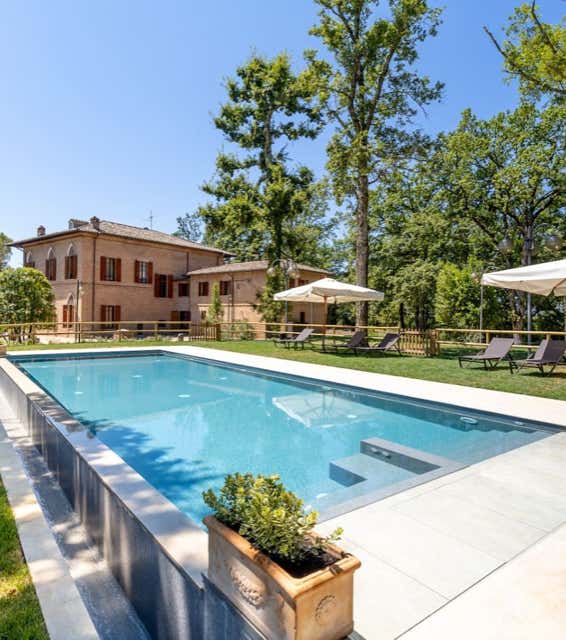 The Villa is a 20th-century estate recently renovated, nestled among the trees of the property for a truly unique experience.On the upper floor, the villa features nine thoughtfully designed bedrooms, each with its own private bathroom, offering unparalleled comfort and tranquility. On the ground floor, there is a spacious dining room and a separate professional kitchen, providing a comfortable and functional space for your staff or private chef.Also on the ground floor, you’ll find a cozy living room and a billiards room, perfect for moments of relaxation and entertainment with family and friends. Outside, there is a large, equipped patio where you can enjoy outdoor meals under the shade of the trees. The heated pool offers a stunning panoramic view of the Umbrian hills, allowing you to immerse yourself in a natural masterpiece. The villa is reached via a private driveway, where one can enjoy shaded walks under the trees while admiring the estate’s horses.